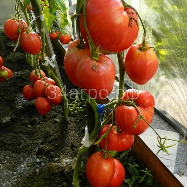Одно из лучших селекционных достижений нашей страны – томат Воловье сердце. Это сортовое негибридное растение, появившееся в 2000 году и изначально предназначенное для открытого грунта южных регионов. Но оно с успехом выращивается и в условиях защищенного грунта Сибири. Культура славится огромными сердцевидными помидорами с мясистой многокамерной мякотью и приятным ароматом. Отдельные плоды могут весить до 800 грамм, но основная масса 300-500 г. В теплице куст достигает двухметровой высоты, на гряде – полутораметровой. В любом случае, ему необходимо ограничить рост прищипкой, вовремя пасынковать, формировать и подвязывать. Выращивают в 2 стебля, высаживая по 2 куста на квадратный метр. Урожайность может достигать 7 кг/м2 (3.5 кг с растения). Отличная устойчивость к грибковым и вирусным заболеваниям. Сорт среднеспелый, до снятия первого урожая проходит 105-115 суток. Помидоры не подлежат долгому хранению, используются в салатах и соках (1 кг = 700 мл сока).