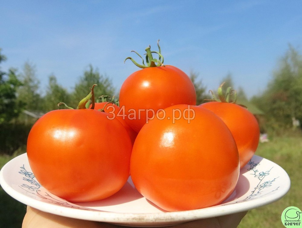 Индетерминантный оранжево-плодный раннеспелый гибрид (97-105 дней). Первое соцветие закладывается над 6-8 листом, последующие соцветия через 2 листа, в кисти по 5-6 плодов. Плоды округлые, гладкие, плотные, оранжевые без зелёного пятна у основания, массой до 350 гр. Отличаются превосходными вкусовыми качествами и повышенным содержанием бета-каротина (в 3-5 раз выше, чем в красноплодных томатах). Жаростойкий, стрессоустойчивый.