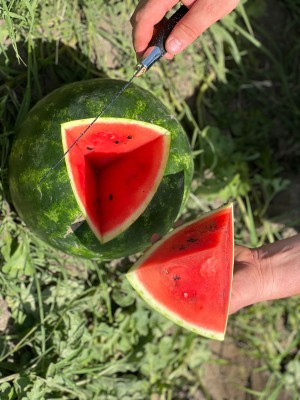 Алисон F1 - Вес 9 -12 кг. Средний вес арбуза при первом сборе 11,5 кг. На втором и последующих сборах - 14 кг. 2-3 полноценных арбуза на плети. Плети средней длины. Плод округлой формы. Ранний срок созревани 50-55 дней. Рубашка темная (суперская). Опередил в созревании всех своих конкурентов. Мякоть арбуза сочная, вкусная, сладкая, красномалинового цвета, хрустящая. Отличная транспортабельность. Не перезревает на поле.