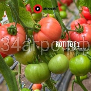 Плоды очень крупного размера – 300…350 грамм. Форма округло-плоская, имеется особенность — тянет «нос» при искусственном опылении. Гибрид наделен устойчивостью к растрескиванию плодов. Томат розового (насыщенно-розового) цвета, зеленые пятна у плодоножек отсутствуют. Томат толстостенный, семечка зеленая.