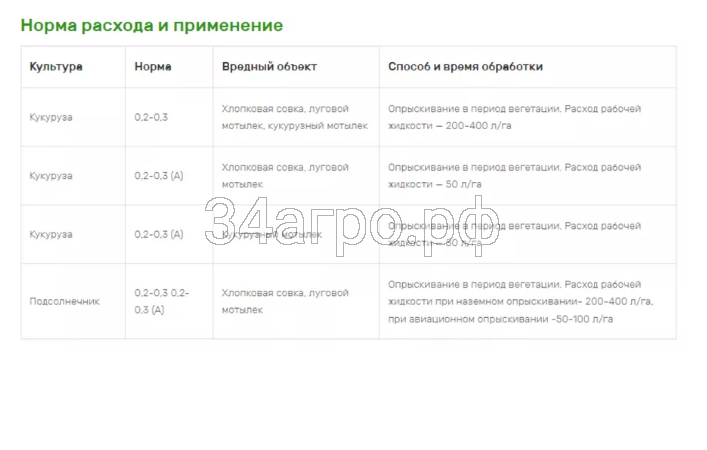 Кукуруза | 0,2-0,3 (А) | Кукурузный мотылек | Опрыскивание в период вегетации. Расход рабочей жидкости – 50 л/га |
