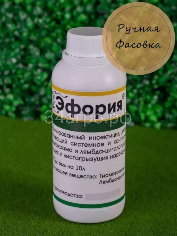 Эфория, КС обеспечивает превосходную защита растений как при проведении плановых обработок, так и при обработках в критических ситуациях. Быстро уничтожает вредителей благодаря лямбда-цигалотрину и действует длительно за счет системного действия тиаметоксама.