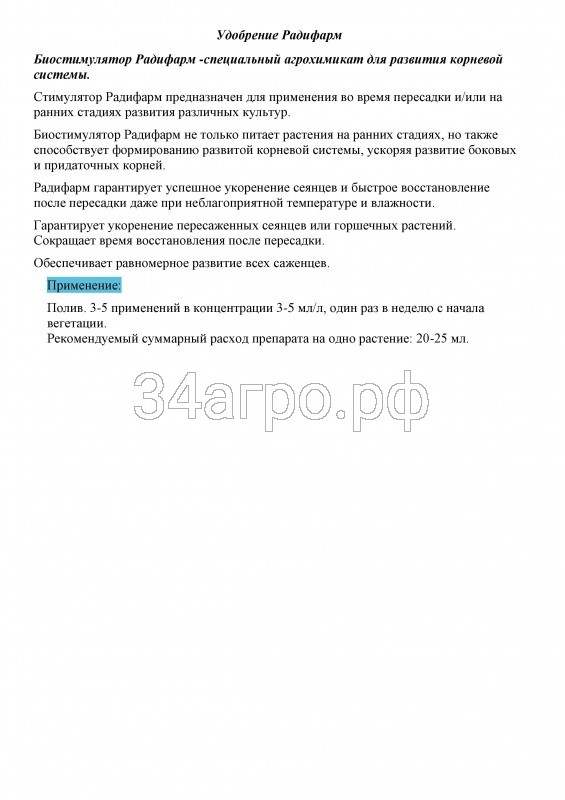- Как же правильно использовать для помидоров, огурцов, клубники, перца и т. д. удобрение «Радифарм»? Инструкция по применению для овощей предельно проста. Однако при использовании этого препарата, конечно же, следует соблюдать дозировки. Для овощных растений «Радифарм» разводится водой в пропорции 10-20 мл на 10 литров. Сам полив производится из расчета 0.5 л на одно растение. Выполнять обработку лучше всего сразу же после посадки. Для рассады используется менее концентрированный раствор. Применяют «Радифарм» при последнем перед пересадкой поливе. Это очень благоприятно сказывается на корнях. Помимо капельного увлажнения почвы или заливания под корень средство «Радифарм» может использоваться для полива методом дождевания. Никакого негативного воздействия на зеленую массу огородных культур этот стимулятор не оказывает.