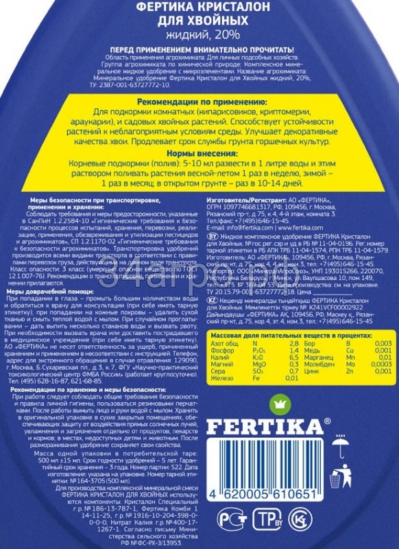 Для подкормки комнатных ( кипарисовиков, криптомерии, араукарии), и садовых хвойных растений. Способствует устойчивости растений к неблагоприятным условиям среды. Улучшает декоративные качества хвои. Продлевает срок службы грунта горшечных культур.