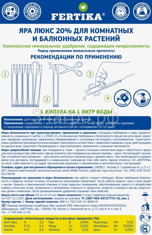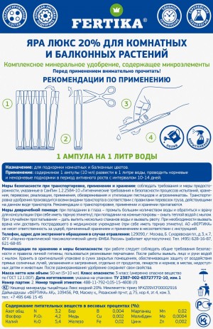Содержимое 1 ампулы (10 мл) развести в 1 литре воды, проводить корневые и некорневые подкормки в период активного роста с интервалом 10-14 дней.