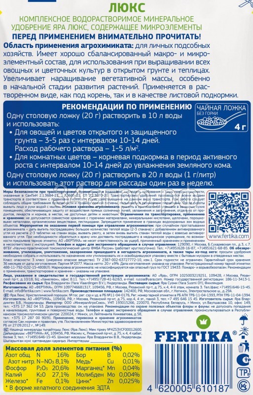 Полностью водорастворимое комплексное азотно-фосфорнокалийное удобрение, содержащее микроэлементы.