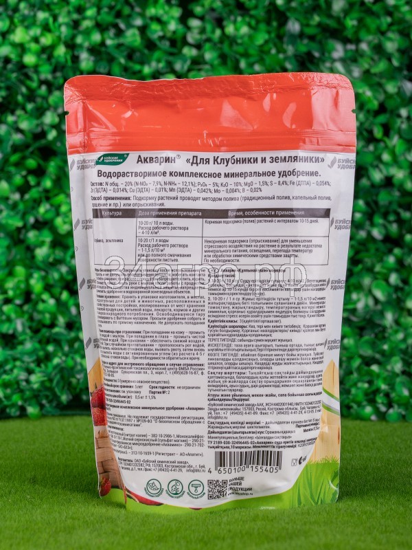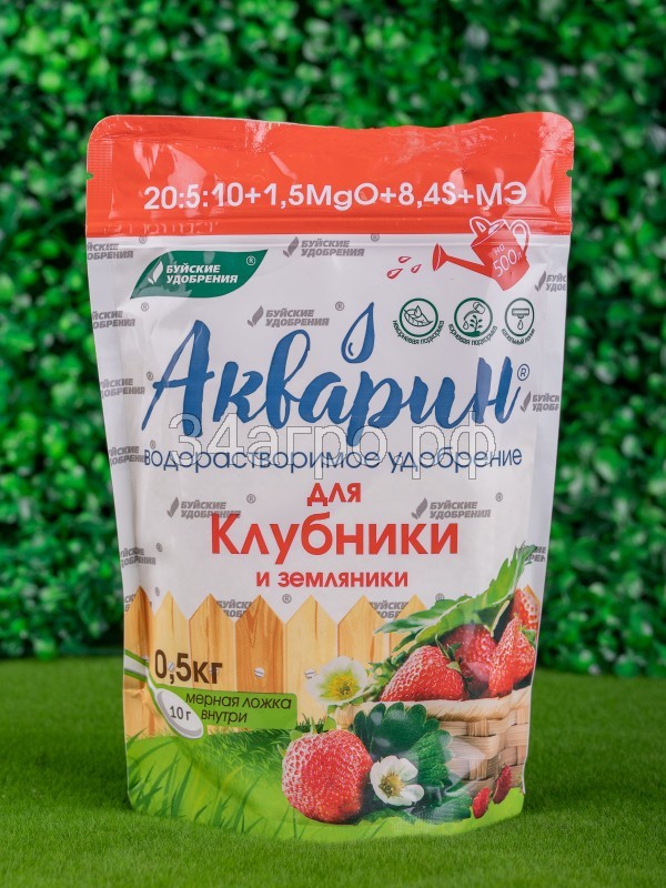 Акварин для клубники и земляники - водорастворимое удобрение, в состав которого входит азот, фосфор, калий, магний, сера и микроэлементы – железо, цинк, марганец, медь в хелатной форме, а бор и молибден – в минеральной. Благодаря кислой реакции (рН) удобрения, оно легко растворяется в холодной воде и более эффективно усваивается корневой системой или листовой поверхностью растений.