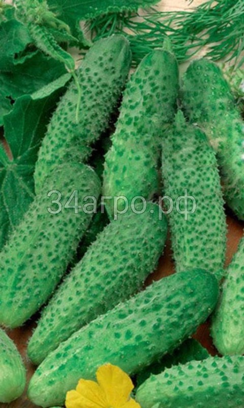 Относится к раннеспелому партенокарпическому гибриду. Общий вид растения считается привлекательным, благодаря наличию букетиков из ярких, изящных женских соцветий. Стебли украшают ярко-зеленные, местами темно-зеленые средней величины листья. На листе можно наблюдать блеклые прожилки, бархатистость и шершавость. Один узел содержит 2-4 огурца. Зеленцы имеют цилиндрическую, немного удлиненную, форму. Огурцы мелкобугорчатые, белошипые, достигают в длину 11-13 см. Вкусовые свойства великолепные, без горечи. Период от первых восходов до обильного плодоношения составляет 46-48 дней.Предпочитает хорошую, плодородную, дренированную почву. Содержание азота в грунте минимальное. Если почва содержит повышенную кислотность, лучше внести известковые удобрения. Посев семян осуществляется 25 мая-5 июня. Посевы укрываются пленкой, для сохранения тепла.